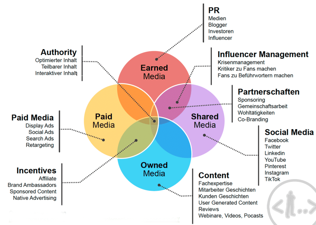 Earned Media bezieht sich auf Medien, die nicht direkt bezahlt werden, sondern durch gute PR-Arbeit und eine starke Online-Präsenz erworben werden. Hierzu zählen beispielsweise Medienberichte, Influencer-Partnerschaften und Kundenbewertungen. Earned Media ist besonders wertvoll, da es von einer dritten Partei vermittelt wird und daher besonders glaubwürdig ist.