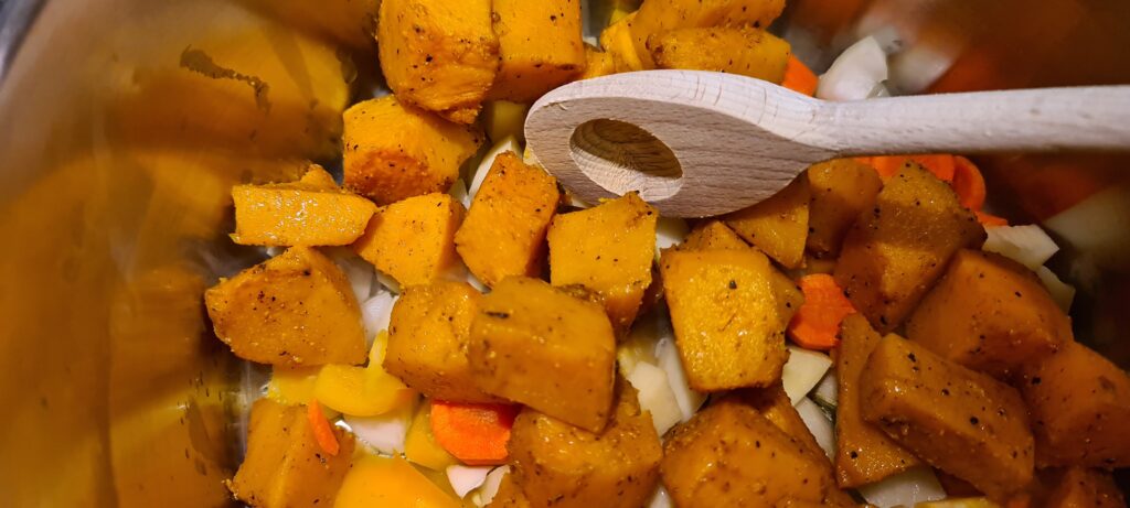Ist das Gemüse weich, nimmt man einen Stabmixer und macht aus den Gemüsewürfeln eine schöne, sämige Suppe. Jetzt entscheidet sich auch, wieviel zusätzliche Flüssigkeit (Bouillon oder Wasser) es noch braucht. Nach dem Pürieren kommen auch nochmals die Gewürze zum Einsatz. Durch das Pürieren verliert die Suppe an Geschmack, was jetzt wieder ausgeglichen werden kann.